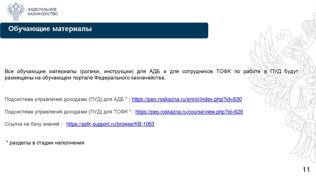 Обучающие материалыВсе обучающие материалы (ролики, инструкции) для АДБ и для сотрудников ТОФК по работе в ПУД будут