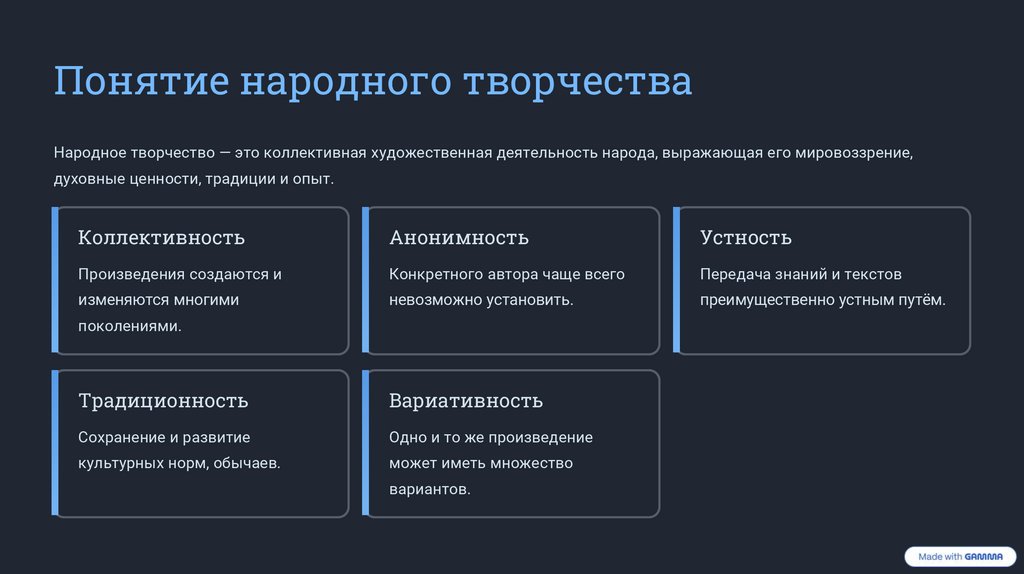 Понятие народного творчестваНародное творчество — это коллективная художественная деятельность народа, выражающая его мировоззрение,