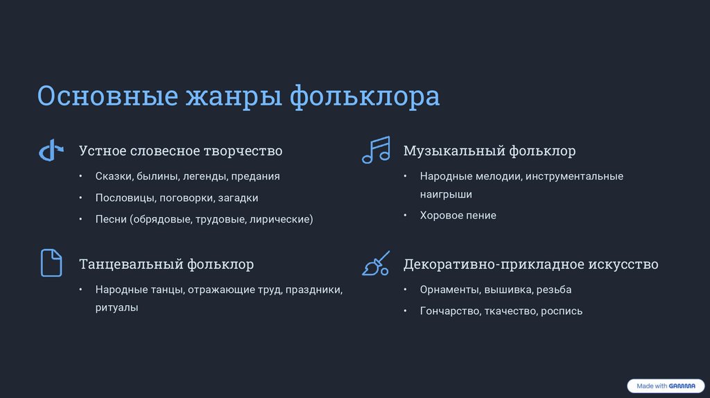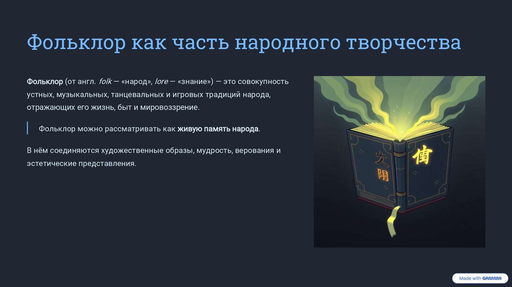 Фольклор как часть народного творчестваФольклор (от англ. folk — «народ», lore — «знание») — это совокупность