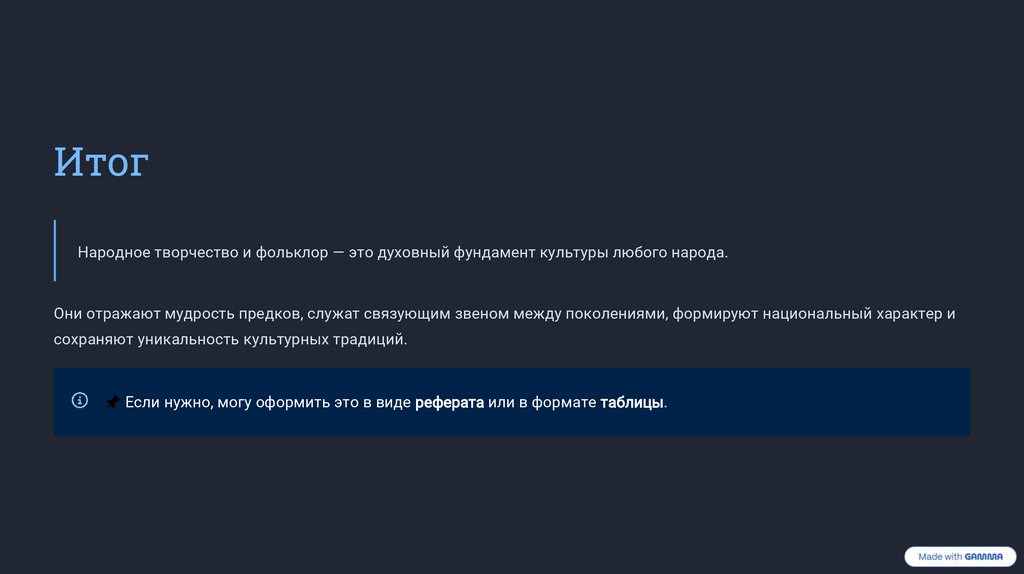 ИтогНародное творчество и фольклор — это духовный фундамент культуры любого народа.