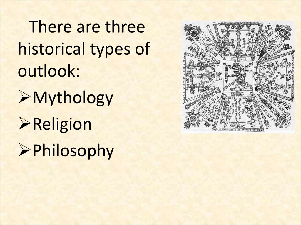 • The role of philosophy in society.• Historical types of worldview: mythology,