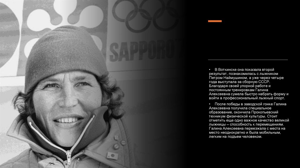 По-настоящему значимой для нее стала олимпиада в Японии 1972 года. Именно Саппоро сделал Галину Алексеевну