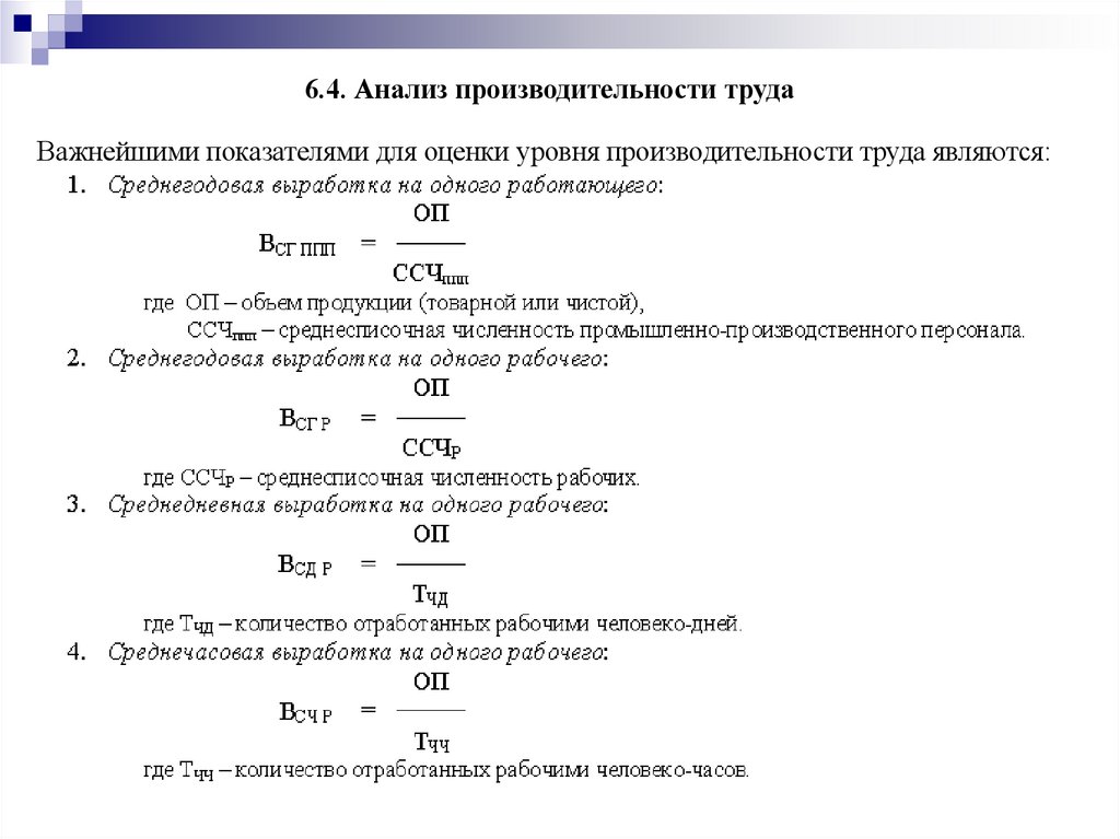 6.4. Анализ производительности трудаВажнейшими показателями для оценки уровня производительности труда являются: