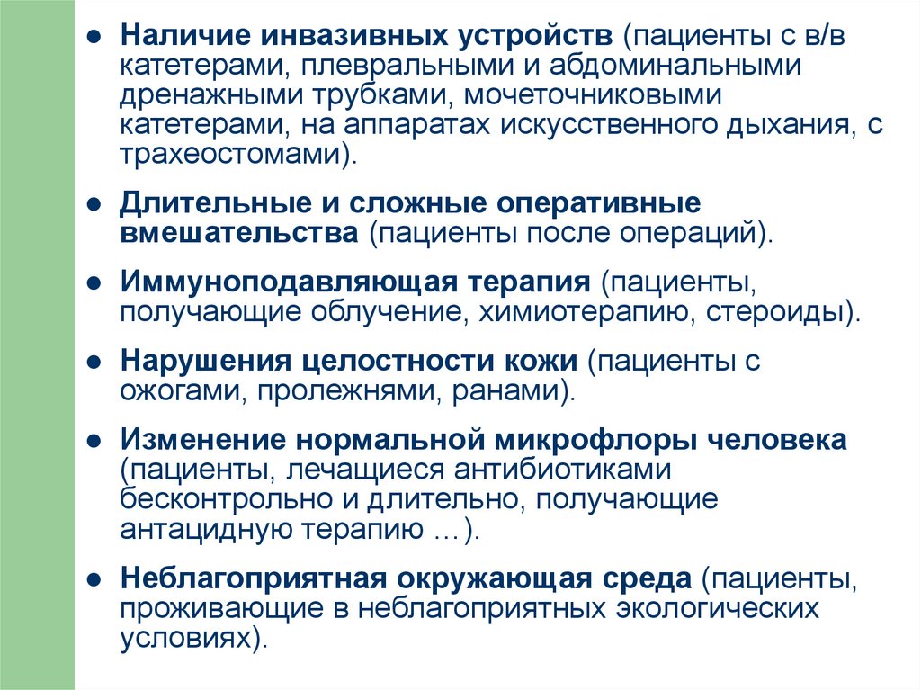 Наличие инвазивных устройств (пациенты с в/вкатетерами, плевральными и абдоминальными
