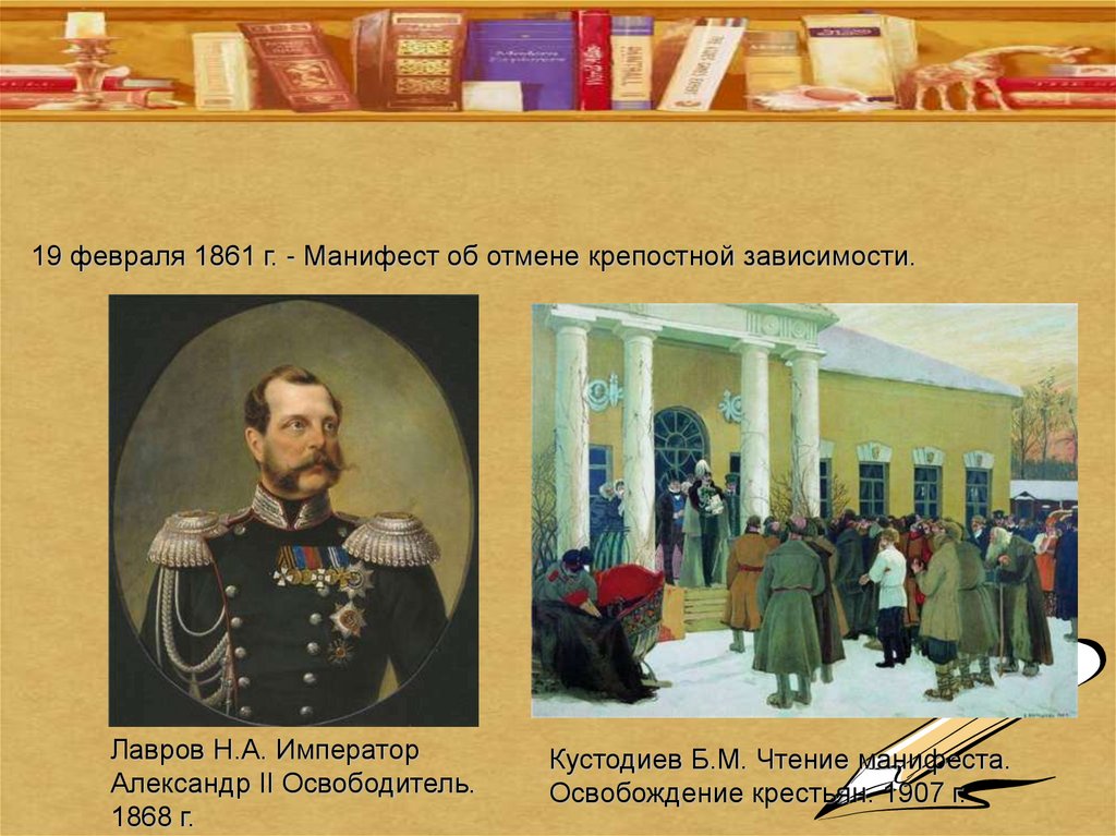 19 февраля 1861 г. - Манифест об отмене крепостной зависимости.Лавров Н.А. Император