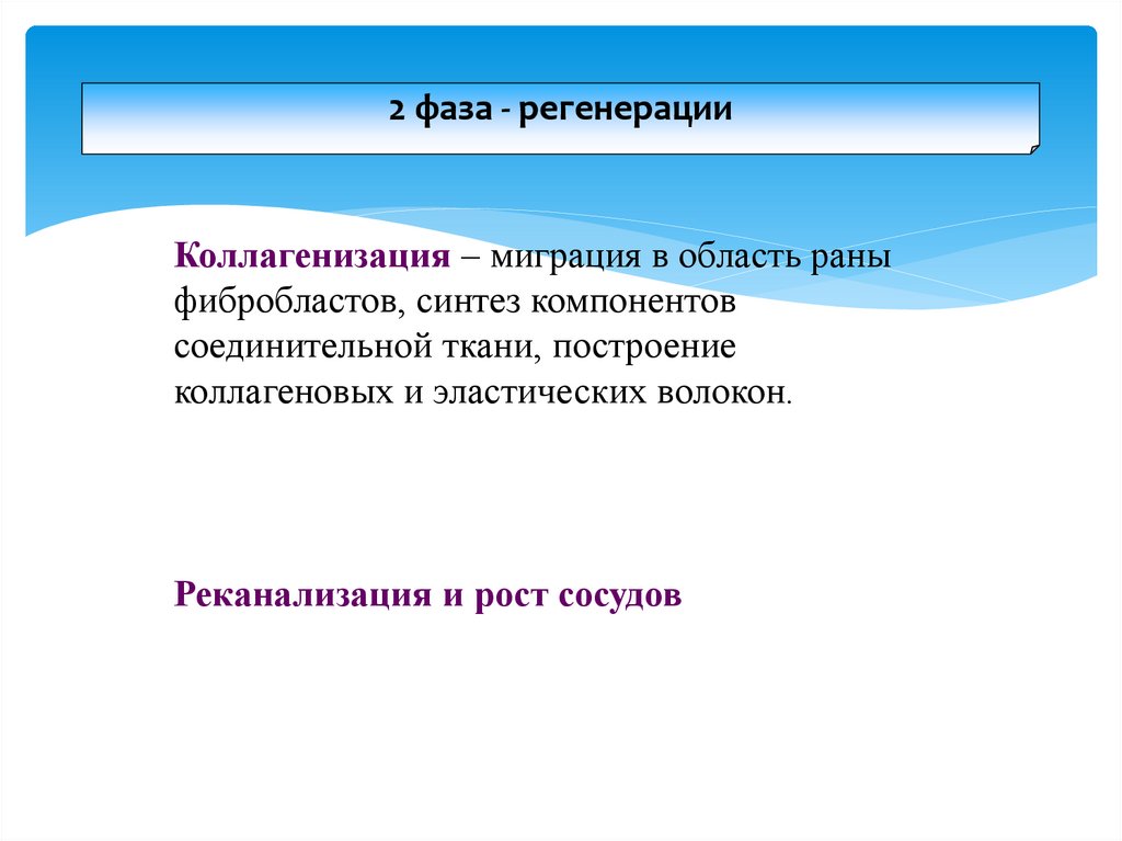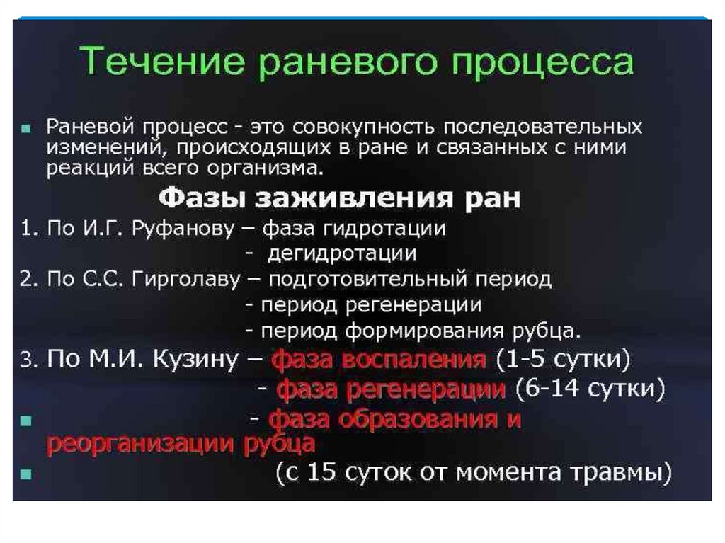 1) воспаление (период сосудистых изменений иочищение раны от некротизированных тканей),