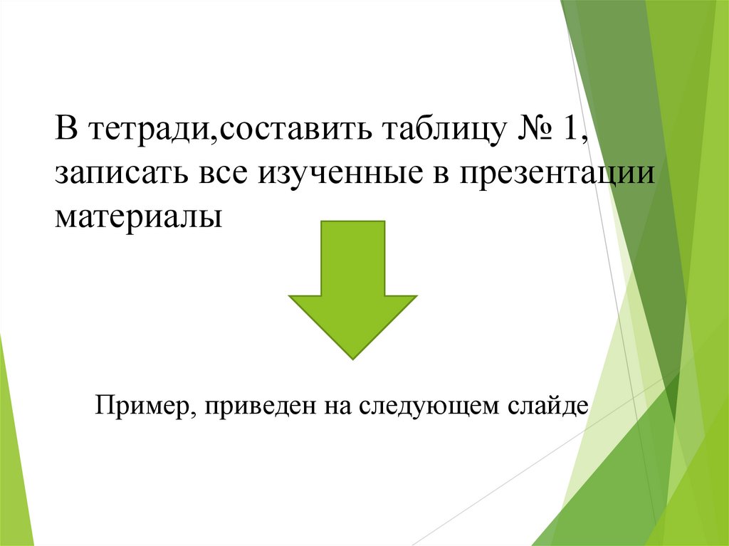 В тетради,составить таблицу № 1,записать все изученные в презентации