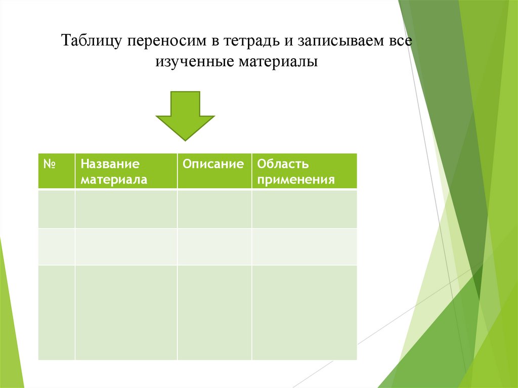 Таблицу переносим в тетрадь и записываем всеизученные материалы