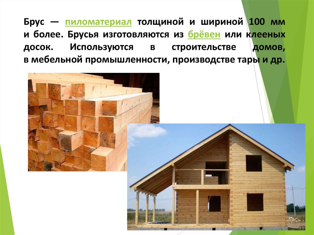 Брус — пиломатериал толщиной и шириной 100 мми более. Брусья изготовляются из брёвен или клееных