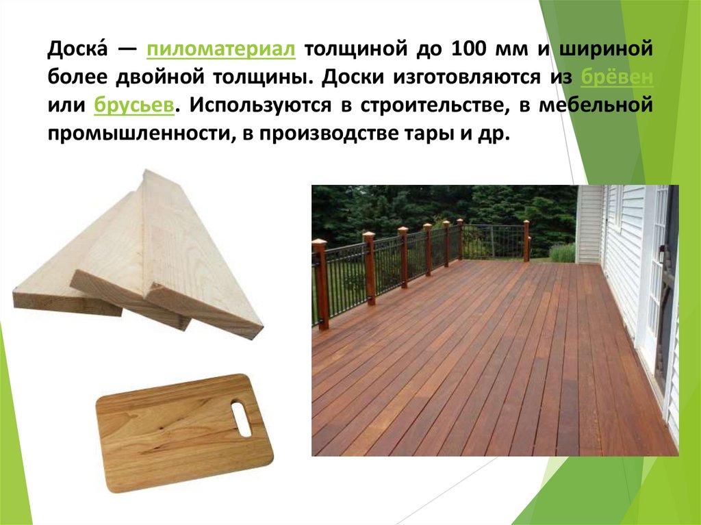 Доска́ — пиломатериал толщиной до 100 мм и ширинойболее двойной толщины. Доски изготовляются из брёвен