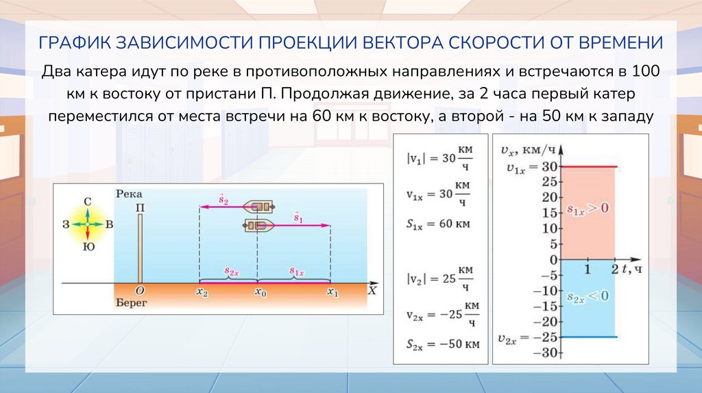 ГРАФИК ЗАВИСИМОСТИ ПРОЕКЦИИ ВЕКТОРА СКОРОСТИ ОТ ВРЕМЕНИДва катера идут по реке в противоположных направлениях и встречаются в 100