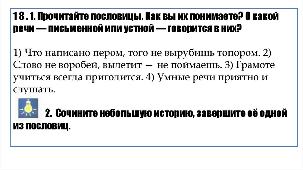 1 8 . 1. Прочитайте пословицы. Как вы их понимаете? О какойречи — письменной или устной — говорится в них?