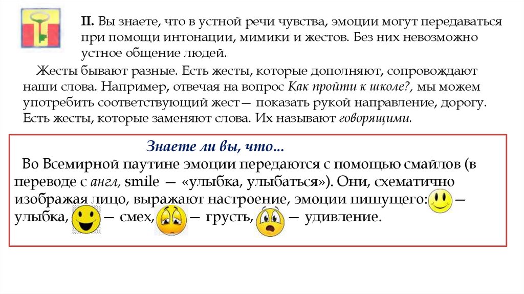 II. Вы знаете, что в устной речи чувства, эмоции могут передаватьсяпри помощи интонации, мимики и жестов. Без них невозможно