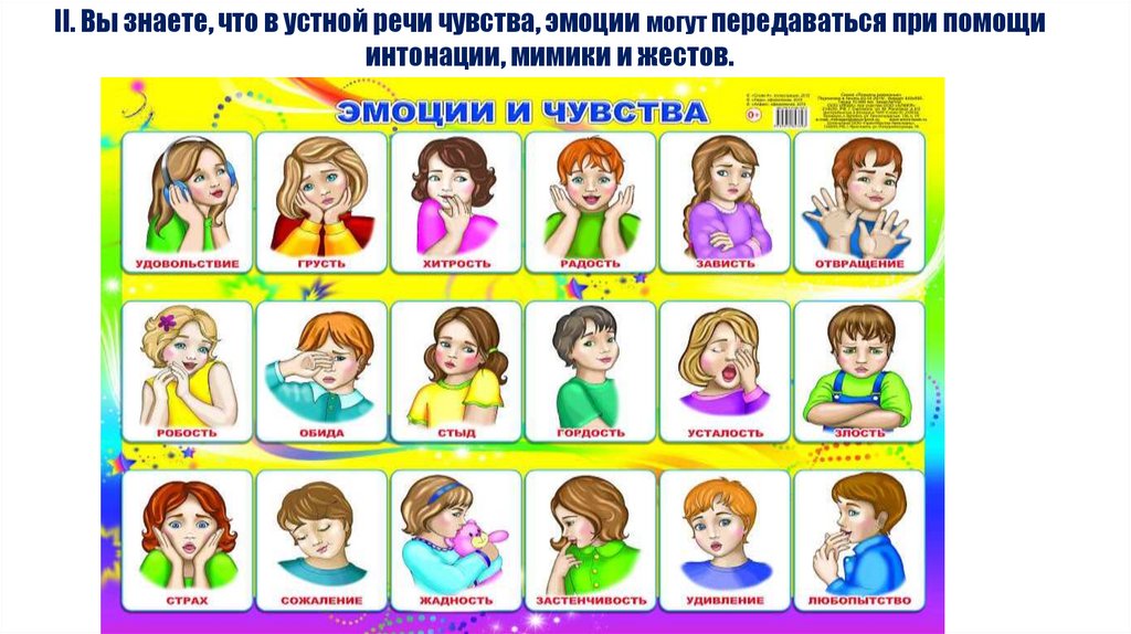 II. Вы знаете, что в устной речи чувства, эмоции могут передаваться при помощиинтонации, мимики и жестов.