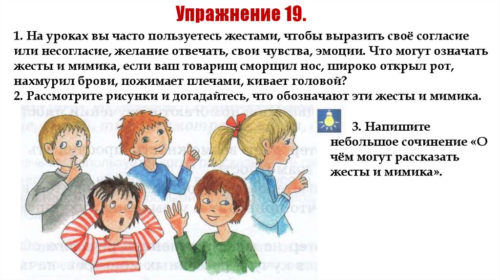 Упражнение 19.1. На уроках вы часто пользуетесь жестами, чтобы выразить своё согласие