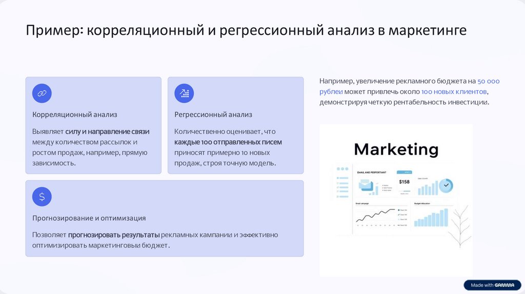 Пример: корреляционный и регрессионный анализ в маркетингеНапример, увеличение рекламного бюджета на 50 000