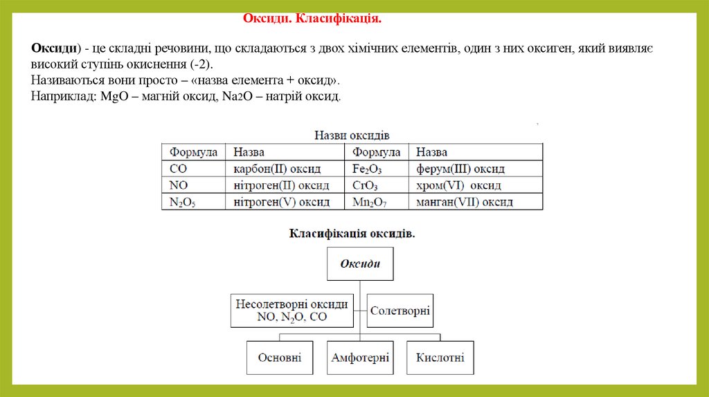 Оксиди. Класифікація.Оксиди) - це складні речовини, що складаються з двох хімічних елементів, один з них оксиген, який виявляє