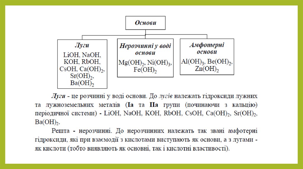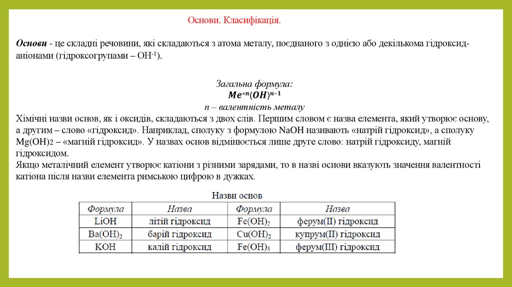 Основи. Класифікація.Основи - це складні речовини, які складаються з атома металу, поєднаного з однією або декількома гідроксиданіонами (гідроксогрупами – ОH-1).
