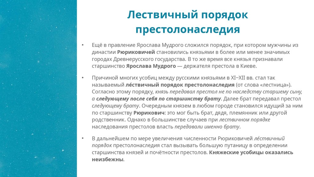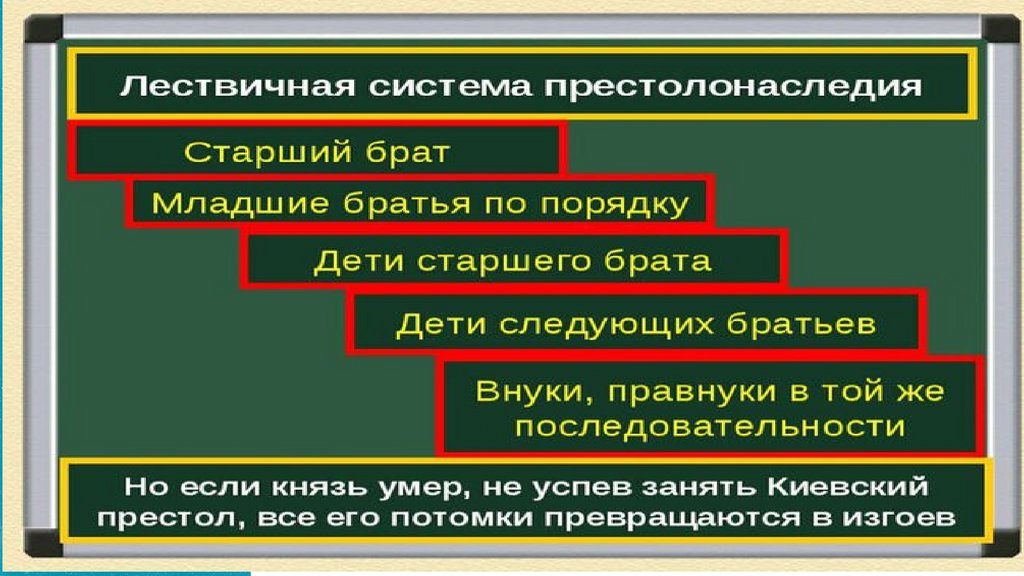 Согласно этому порядку, князь передавал престол не по наследству старшему сыну,