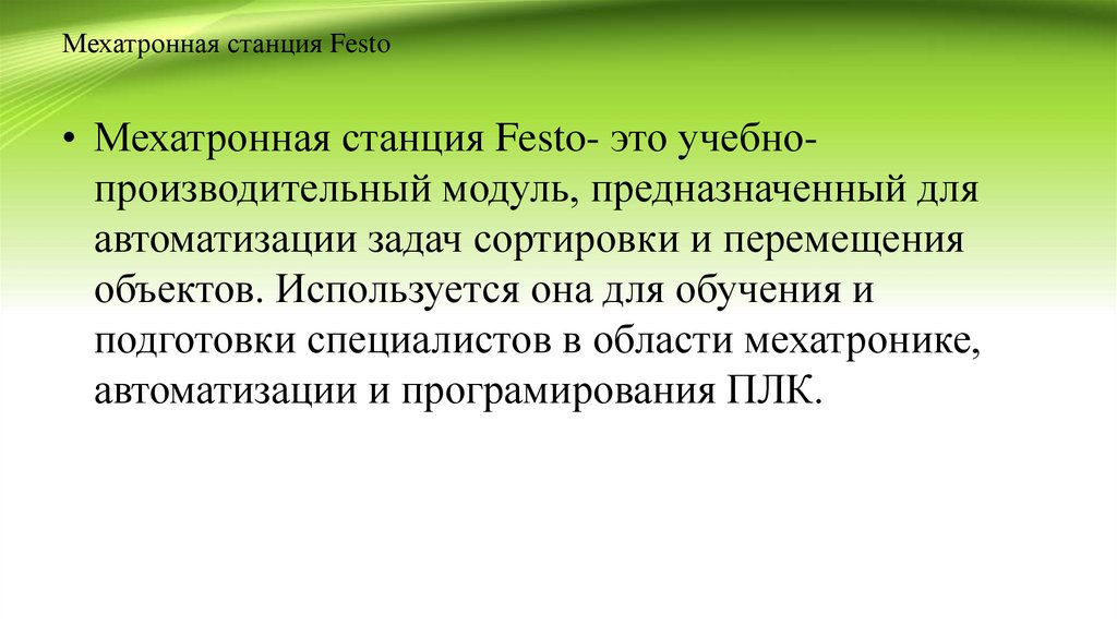 Мехатронная станция Festo• Мехатронная станция Festo- это учебнопроизводительный модуль, предназначенный для