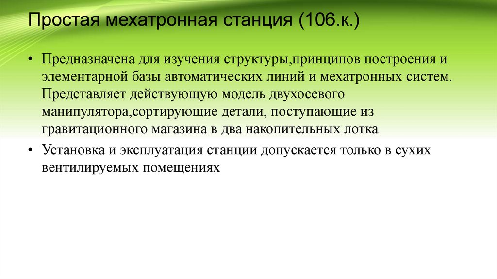 Простая мехатронная станция (106.к.)• Предназначена для изучения структуры,принципов построения и