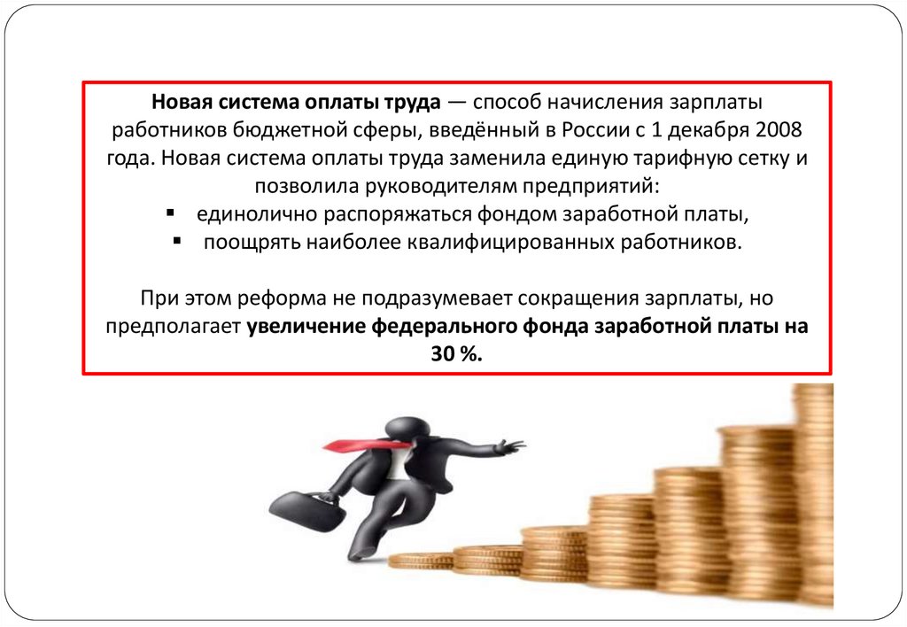 Новая система оплаты труда — способ начисления зарплатыработников бюджетной сферы, введённый в России с 1 декабря 2008