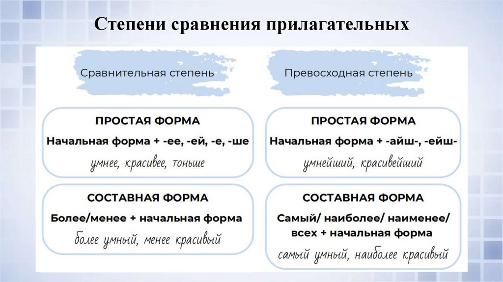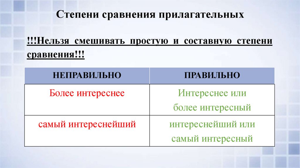 Степени сравнения прилагательных!!!Нельзя смешивать простую и составную степени