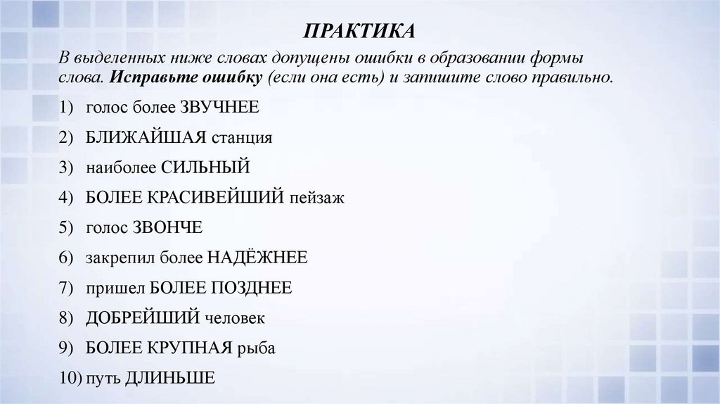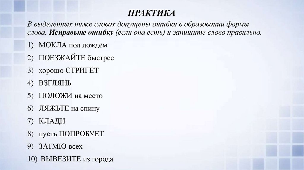 ПРАКТИКАВ выделенных ниже словах допущены ошибки в образовании формы