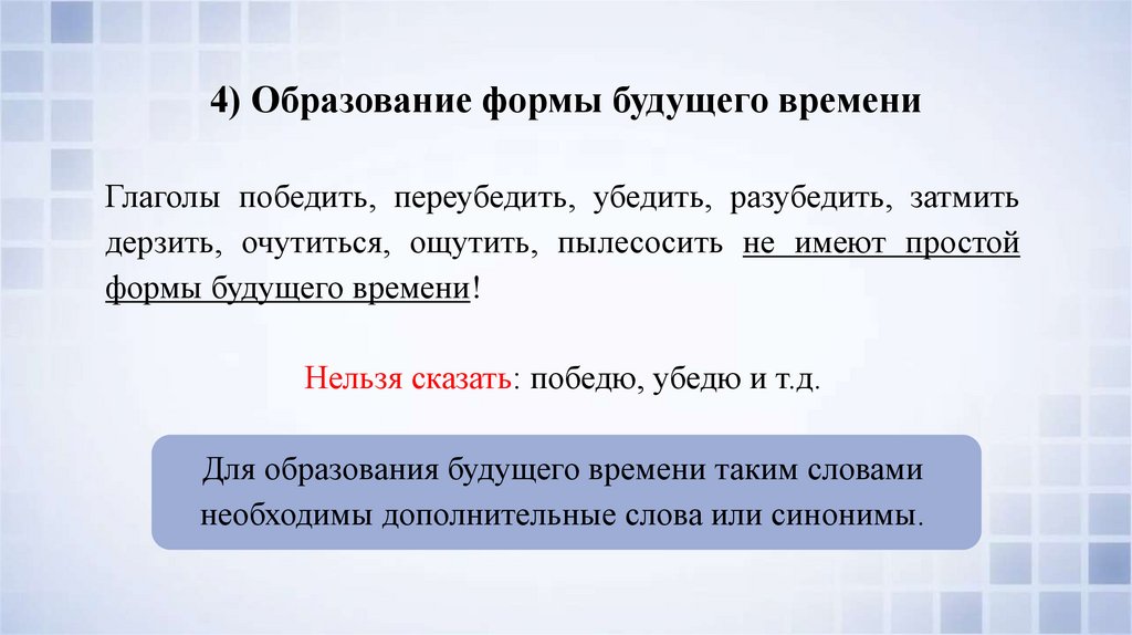 4) Образование формы будущего времениГлаголы победить, переубедить, убедить, разубедить, затмить