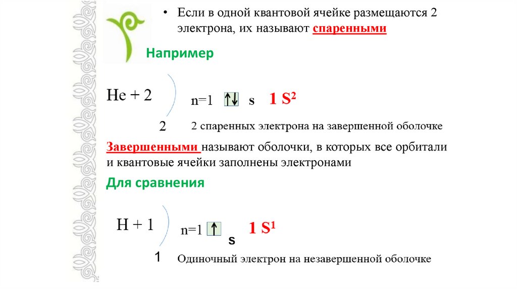 • Если в одной квантовой ячейке размещаются 2электрона, их называют спаренными