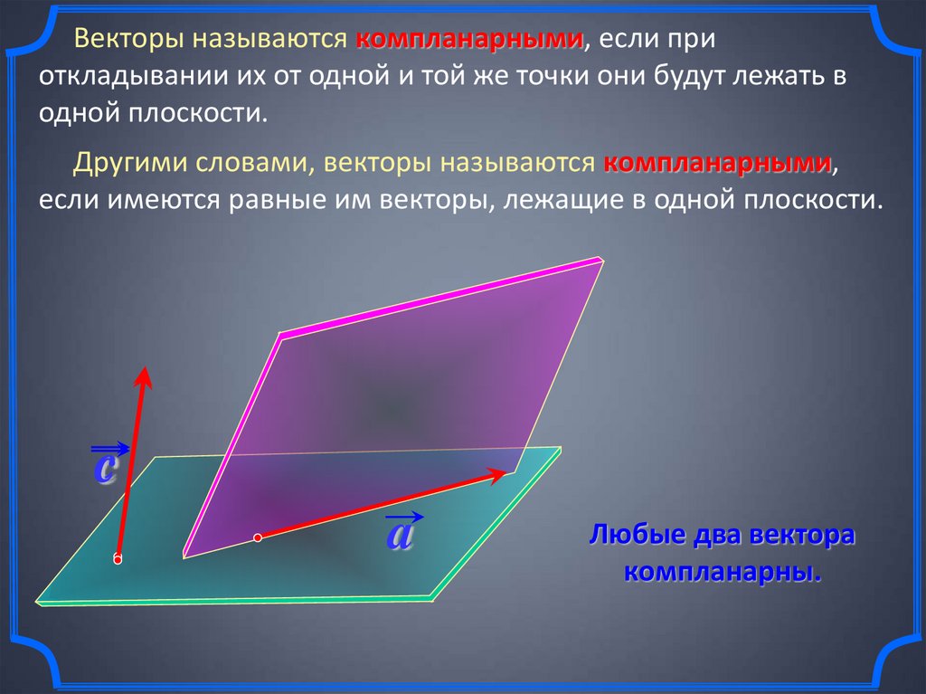 Векторы называются компланарными, если приоткладывании их от одной и той же точки они будут лежать в