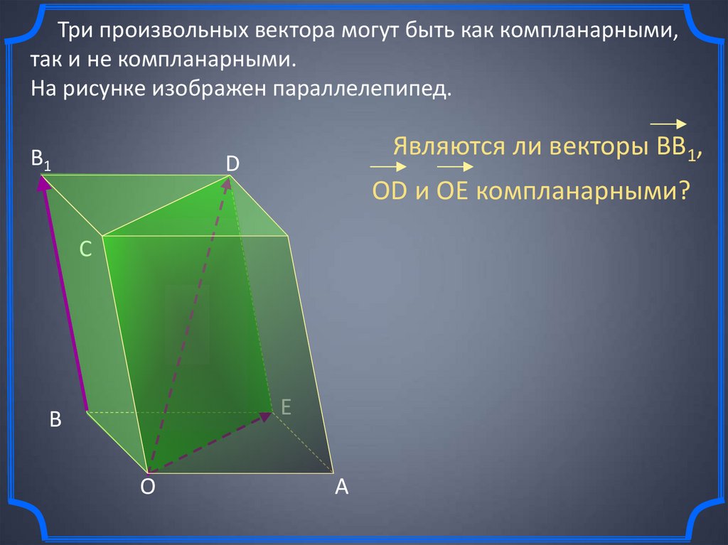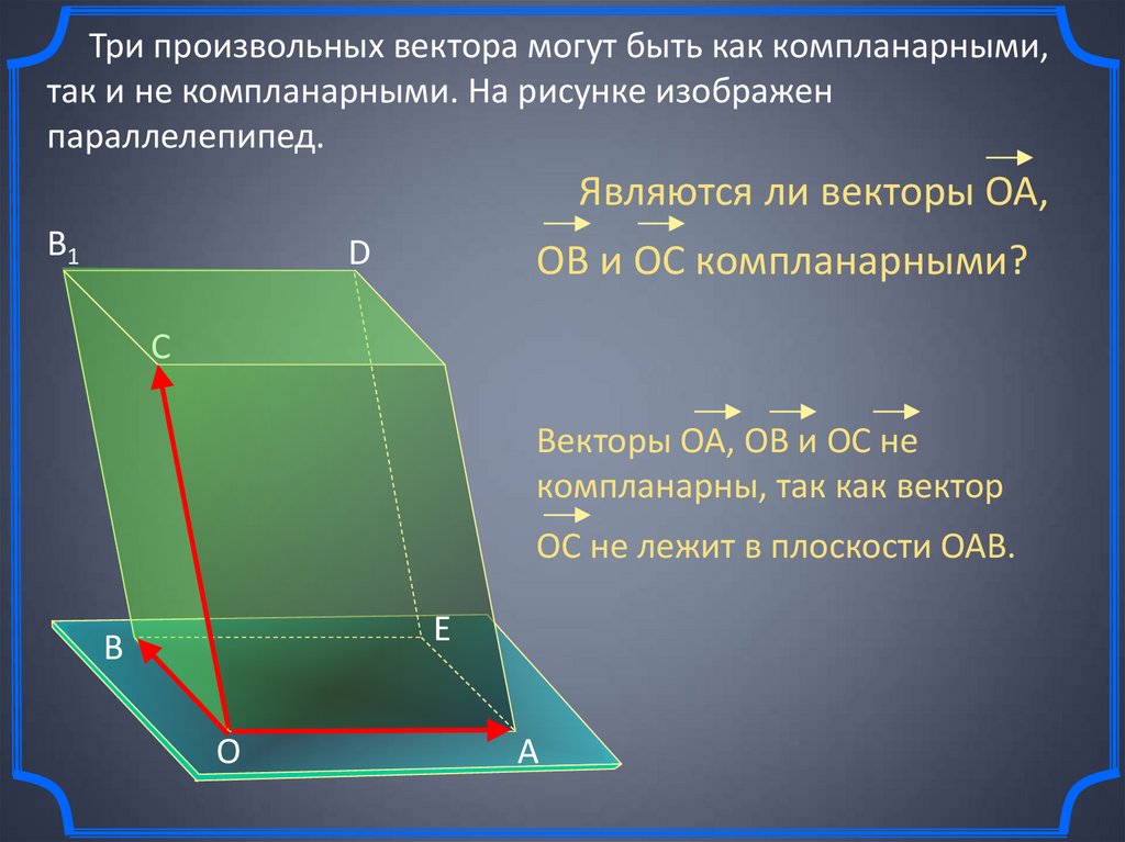 Три произвольных вектора могут быть как компланарными,так и не компланарными. На рисунке изображен