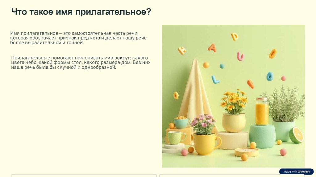 Что такое имя прилагательное?Имя прилагательное — это самостоятельная часть речи,
