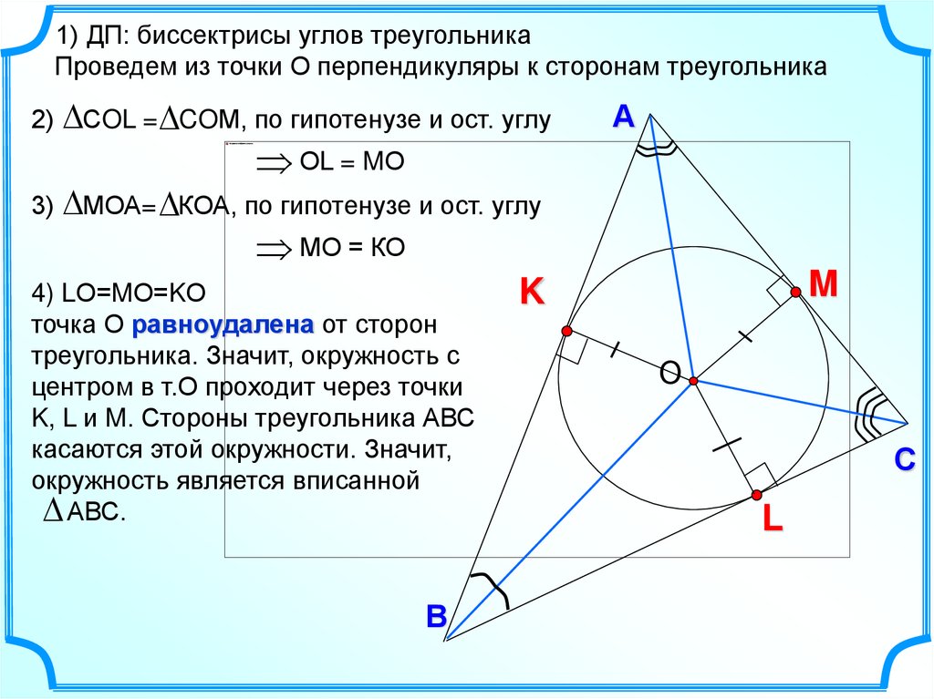 1) ДП: биссектрисы углов треугольникаПроведем из точки О перпендикуляры к сторонам треугольника