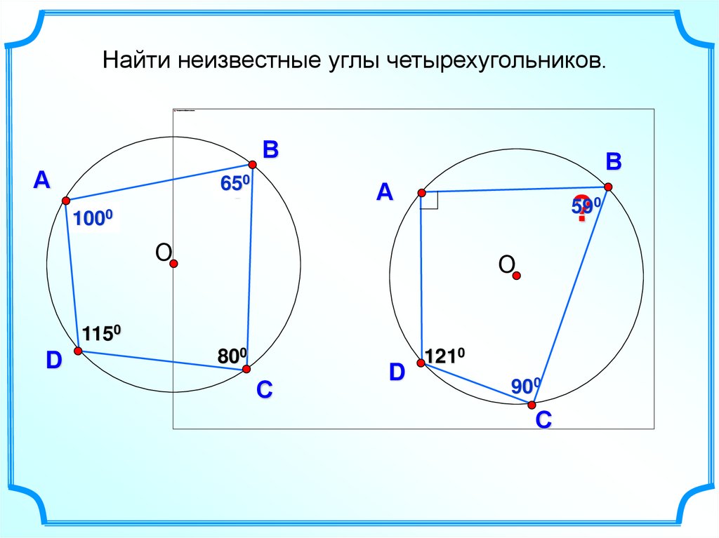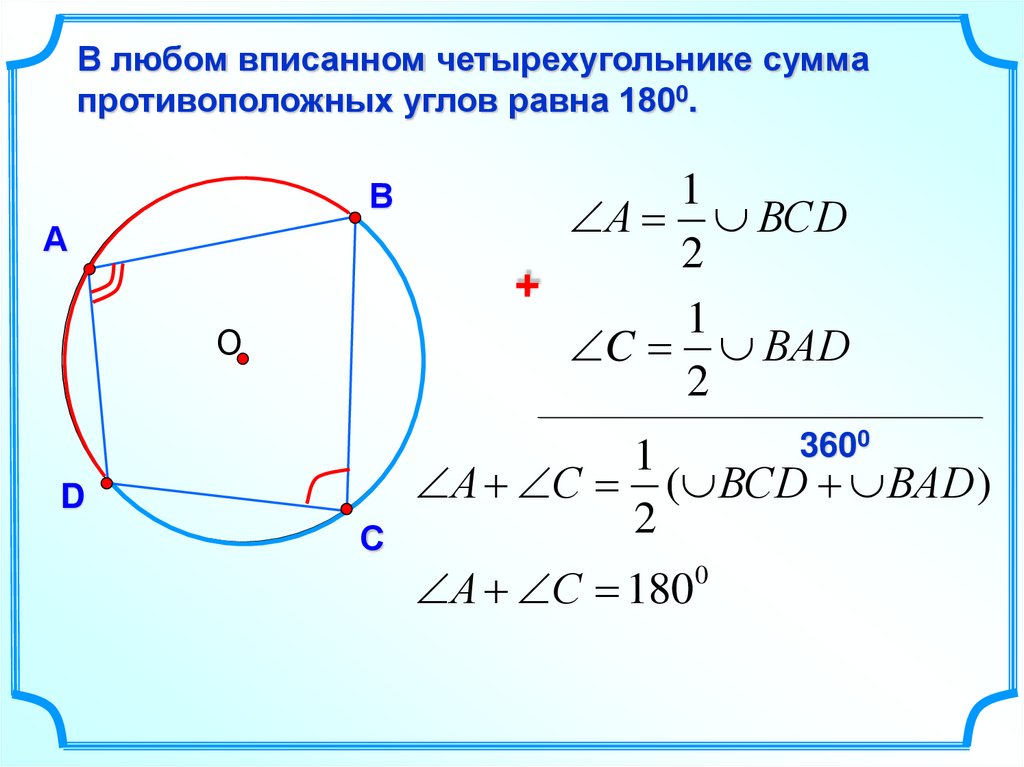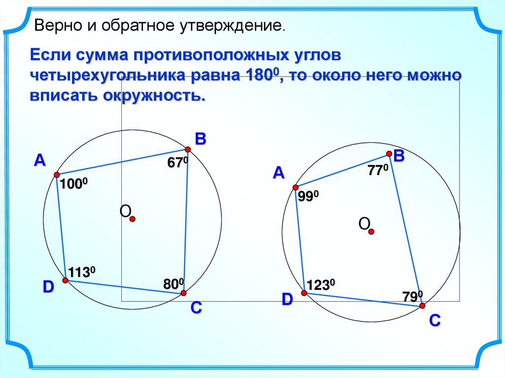 В любом вписанном четырехугольнике суммапротивоположных углов равна 1800.
