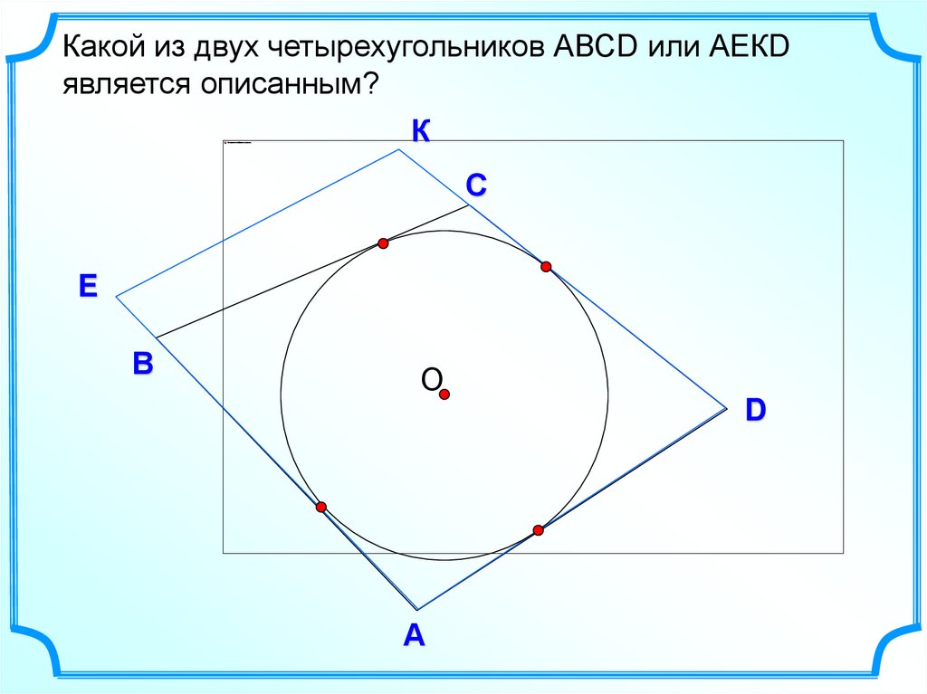 Какой из двух четырехугольников АВСD или АЕКDявляется описанным?