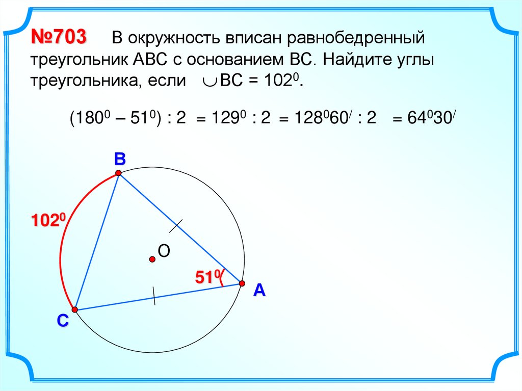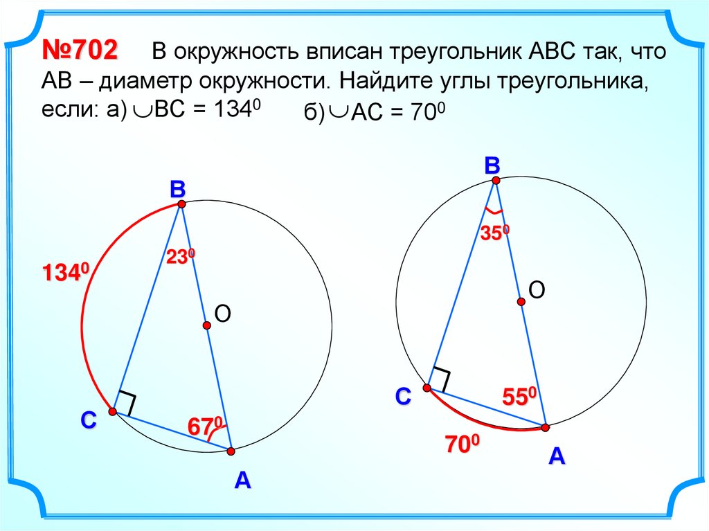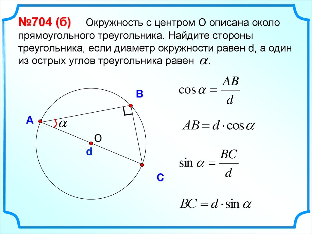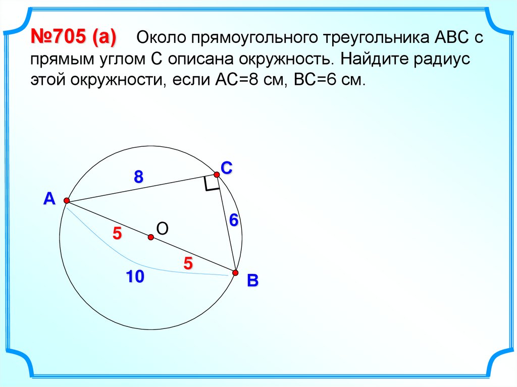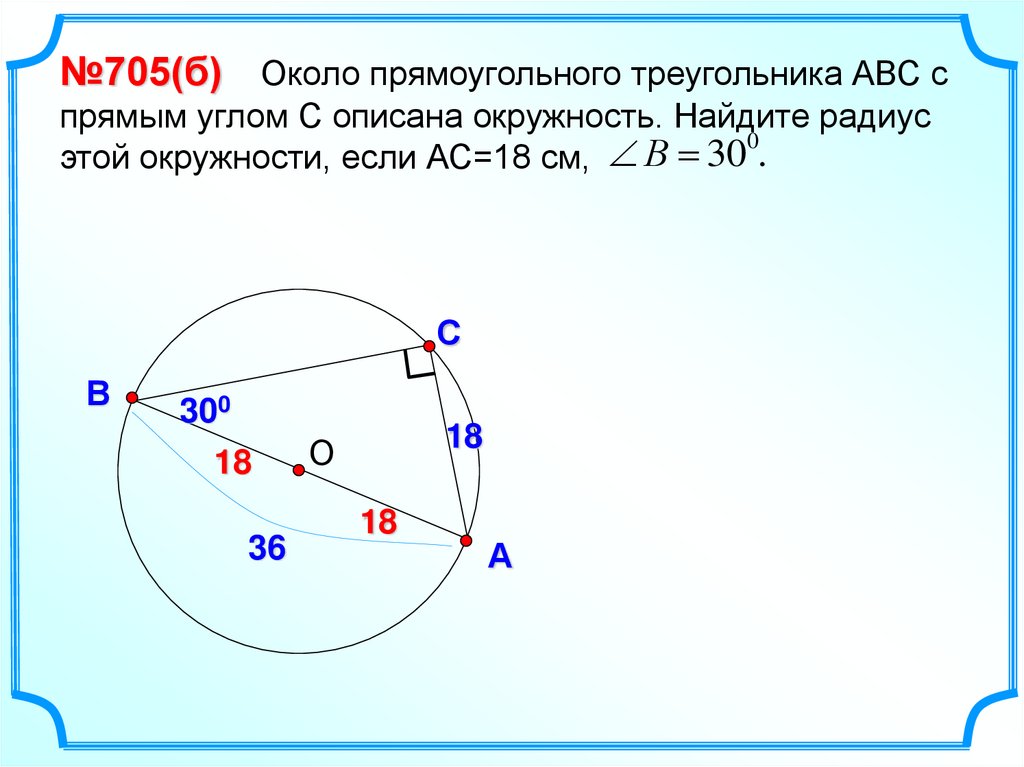 №705(б) Около прямоугольного треугольника АВС спрямым углом С описана окружность. Найдите радиус