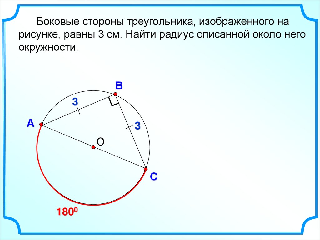 Боковые стороны треугольника, изображенного нарисунке, равны 3 см. Найти радиус описанной около него
