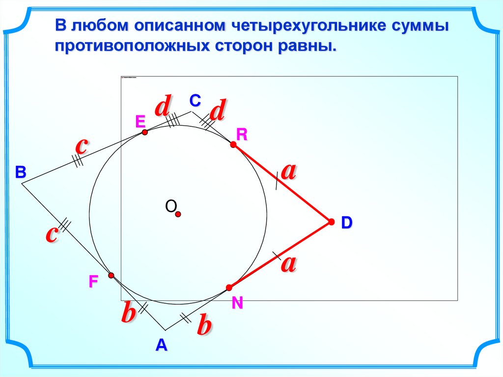 В любом описанном четырехугольнике суммыпротивоположных сторон равны.