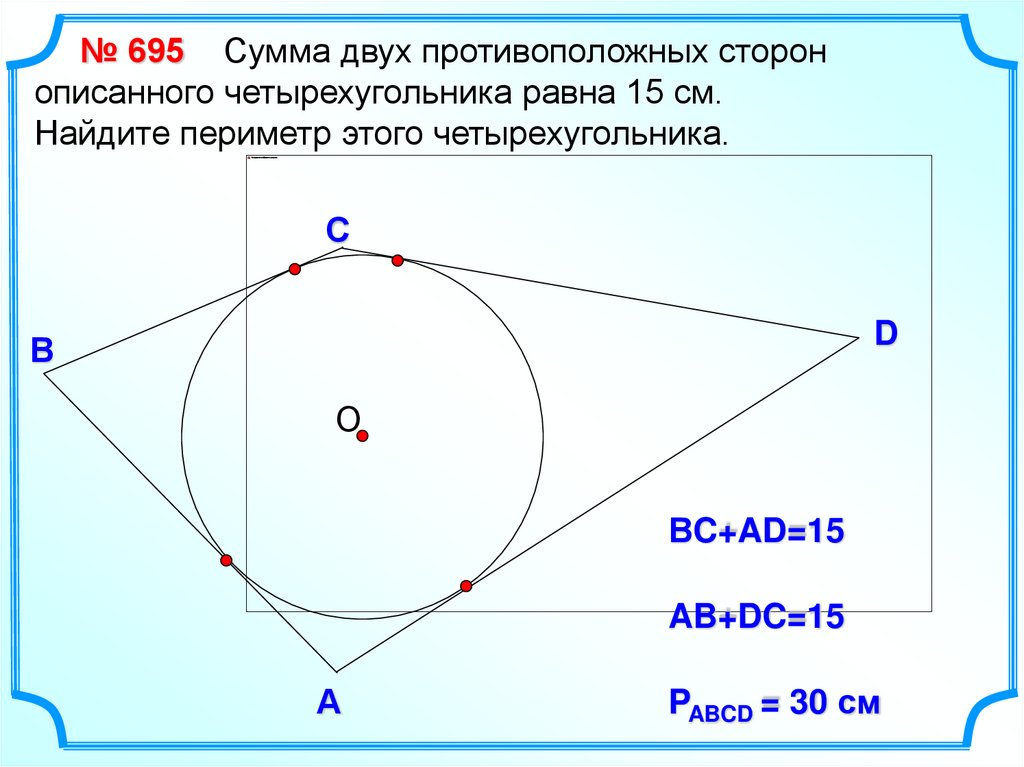 № 695 Сумма двух противоположных сторонописанного четырехугольника равна 15 см.