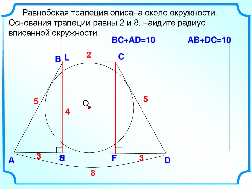 Равнобокая трапеция описана около окружности.Основания трапеции равны 2 и 8. найдите радиус