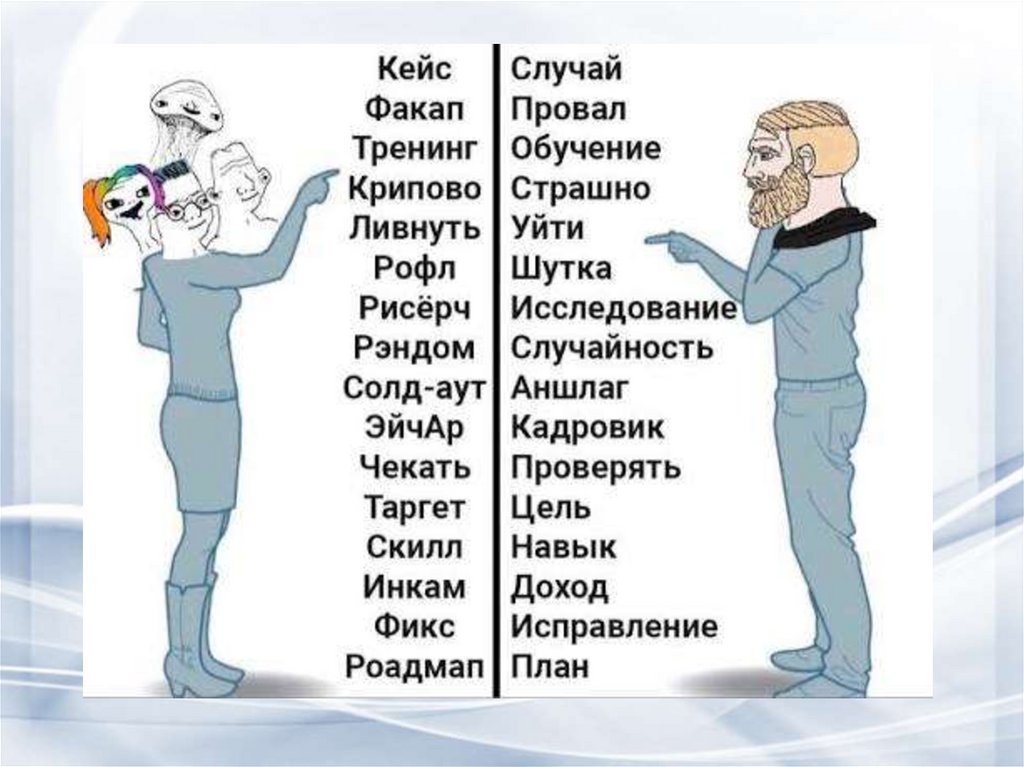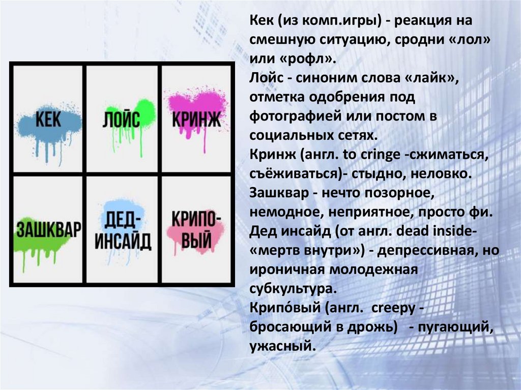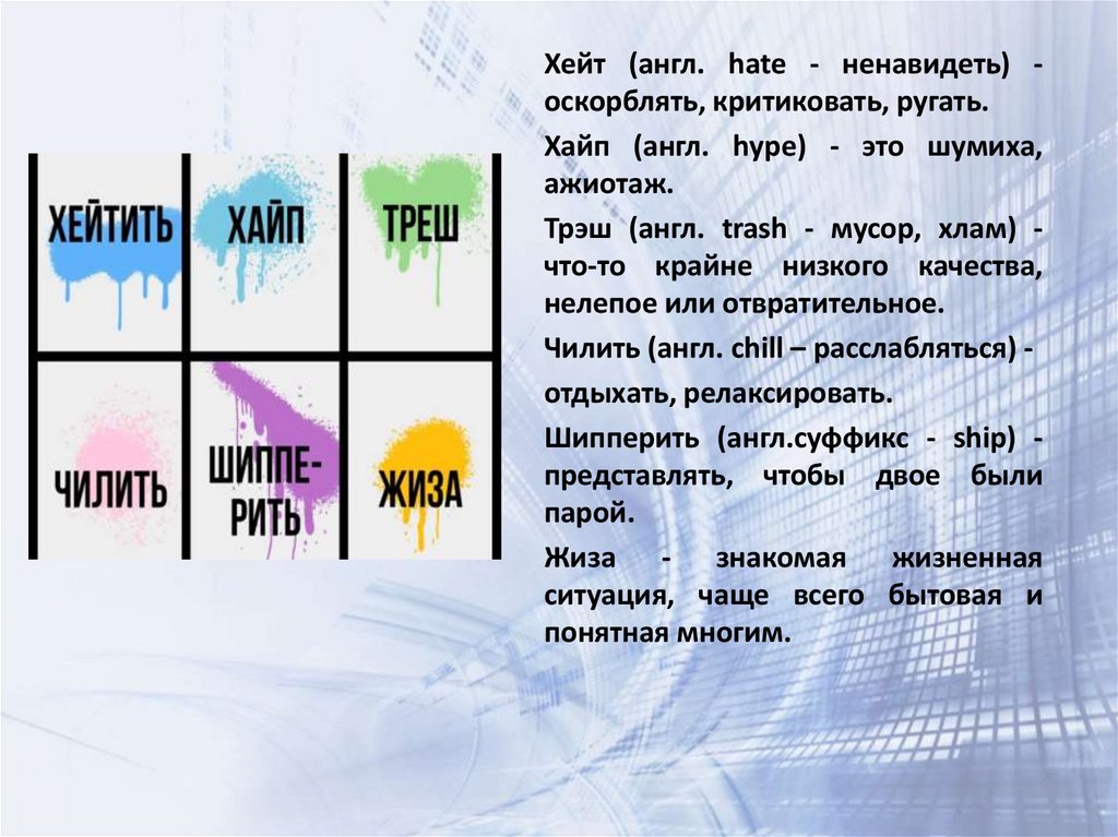 (спасибо), имхо (круто), заимствованные слова лайк, репост, бан.