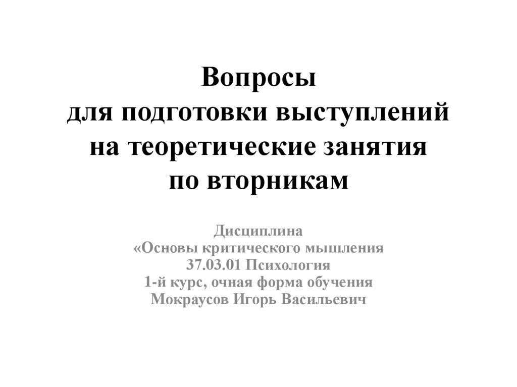 1. Вопросы для подготовки выступлений на теоретические занятия по вторникам