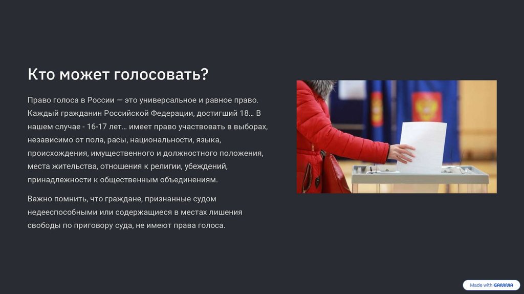 Кто может голосовать?Право голоса в России — это универсальное и равное право.