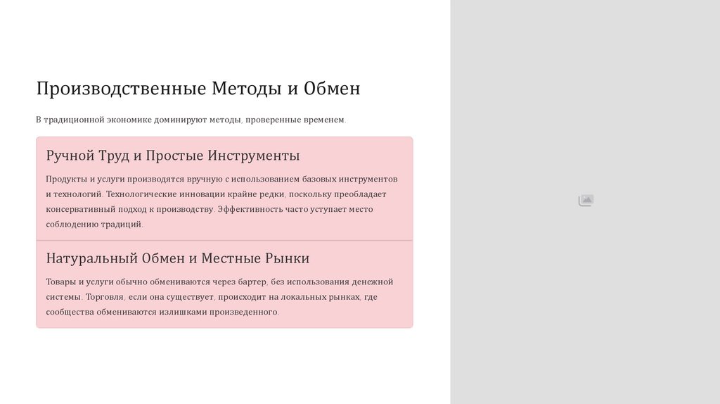 Производственные Методы и ОбменВ традиционной экономике доминируют методы, проверенные временем.