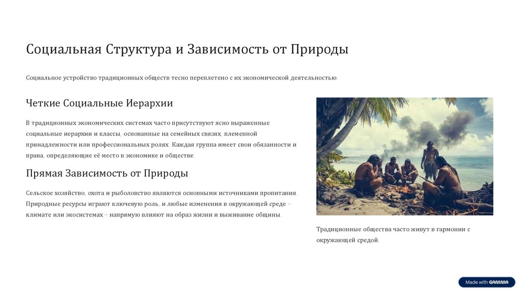 Социальная Структура и Зависимость от ПриродыСоциальное устройство традиционных обществ тесно переплетено с их экономической деятельностью.