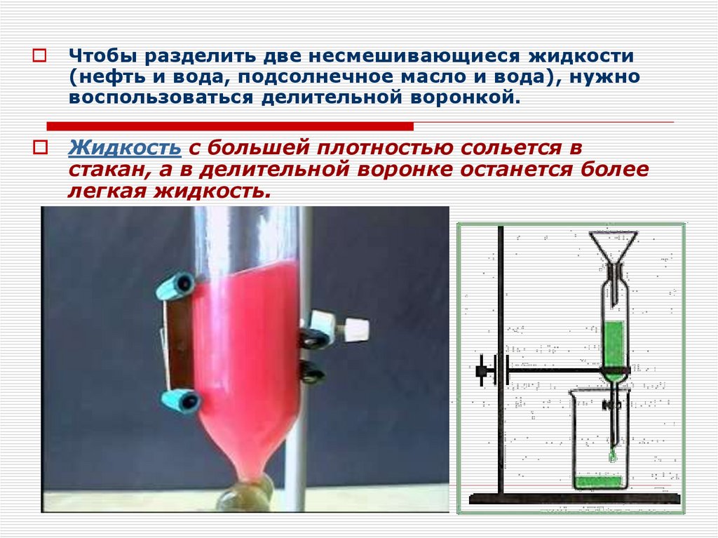 Чтобы разделить две несмешивающиеся жидкости(нефть и вода, подсолнечное масло и вода), нужно