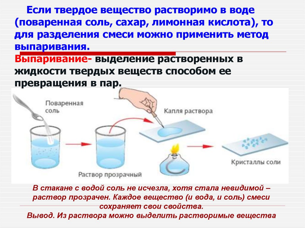 Если твердое вещество растворимо в воде(поваренная соль, сахар, лимонная кислота), то
