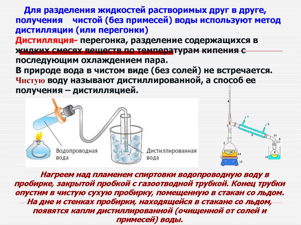 Для разделения жидкостей растворимых друг в друге,получения чистой (без примесей) воды используют метод