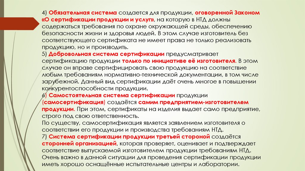 4) Обязательная система создается для продукции, оговоренной Законом«О сертификации продукции и услуг», на которую в НТД должны